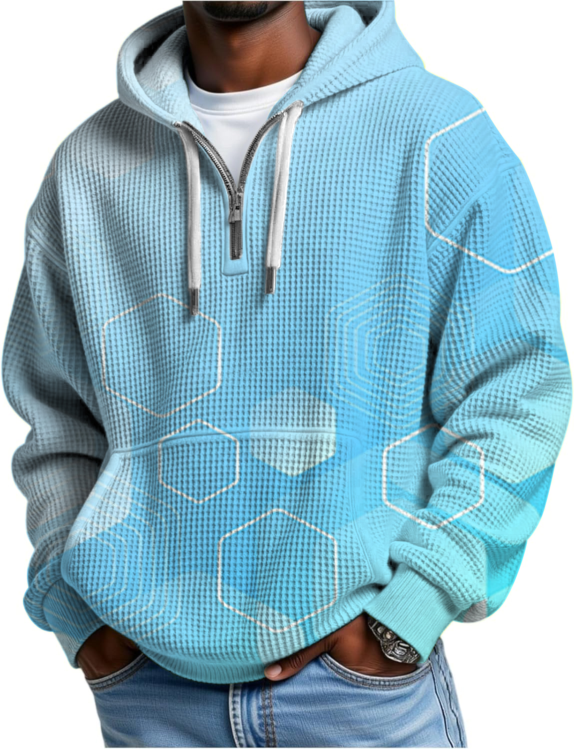 Thiết kế: Sự kết hợp hoàn hảo giữa kiểu dáng áo Hoodie Half-zip (khóa kéo nửa ngực) hiện đại và bề mặt vải dệt tổ ong (Waffle) 3D nổi bật, mang đến vẻ ngoài trẻ trung và thời thượng. Form dáng gọn gàng, vừa vặn, cực kỳ dễ phối đồ và phù hợp để đi học, đi làm hoặc mặc hàng ngày.